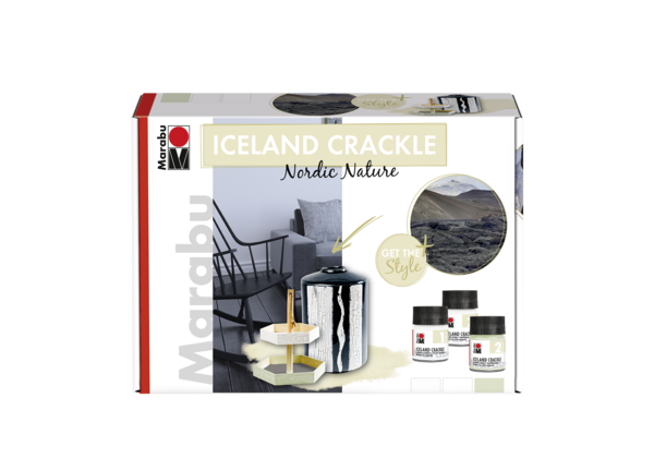 Marabu ICELAND CRACKLE je farba a médium na báze vody na vytváranie špeciálnych popraskaných efektov. Farba a médium sa môžu aplikovať na nasiakavé povrchy, ako sú drevo, MDF, papierová hmota (maché), papier, kameň, keramiku, hlinu, polystyrén, plátno a iné. Nanášajú sa štetcom alebo špachtľou. Farba veľmi dobre kryje, rýchlo schne, je svetlostála, odolná voči poveternostným vplyvom a voči oteru.