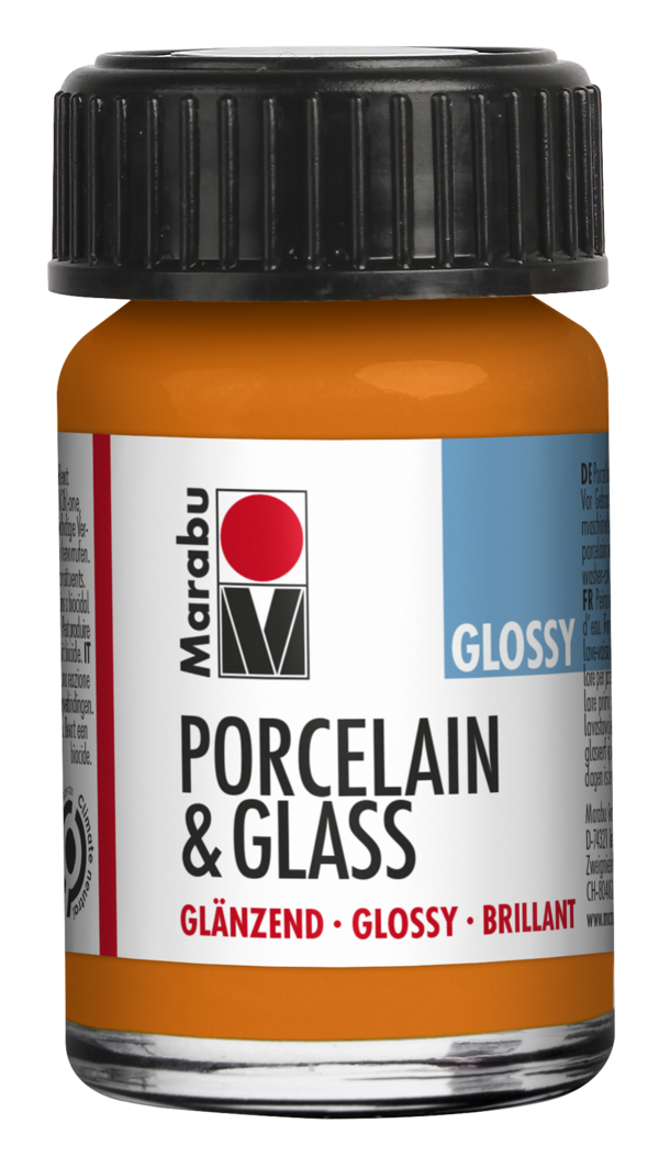 Porcelain & Glas - lesklá transparentná farba na vodnej báze.Na maľovanie na sklo, porcelán, keramiku a akrylové sklo atď. Nie je nutné vypaľovanie: farba zaschne po troch dňoch, potom je možné umývať v umývačke pri teplote max. 50 °C.Povrch musí byť zbavený mastnoty.Farbu dobre premiešajte.V kombinácii s Porcelain & Glas Painter je možné farbu bez problémov vypáliť 30 min.pri 160 °C.